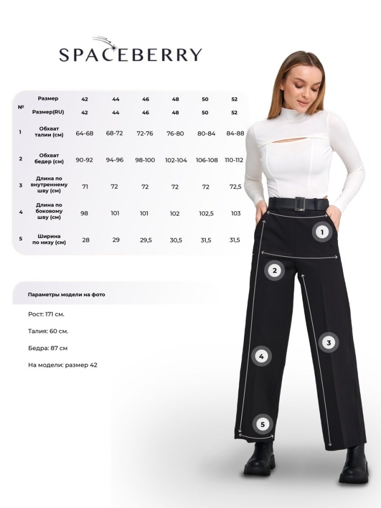 У нас скидки на брюки! Женские прямые широкие брюки из плотного трикотажа Джерси - вещь, которая должна быть в гардеробе каждой девушки на летний и зимний сезон! Оригинальная модель идеально сидит на фигуре любого типа благодаря завышенной линии талии, а также отстроченным и заутюженным стрелкам, которые визуально стройнят ноги. Модные брюки на резинке и карманами легко сочетаются в комплекте с жакетом, базовой футболкой, объёмным свитером или рубашкой, с черным кожаным плащом на весну. Благодаря свободному крою, вам не придется жертвовать стилем ради комфорта, брюки кюлоты сделаны из современной плотной и мягкой ткани, которая позволит вам чувствовать себя уверенно в течение всего дня. Такие штаны палаццо с высокой посадкой с отлично подойдут для девушек подростков невысокого роста, рост модели - 171 см. Стирать данную модель можно на режиме деликатной стирки 30 C. Вы можете найти другие модели одежды нашего бренда, кликнув на логотип Spaceberry. Будем рады вашим отзывам!
